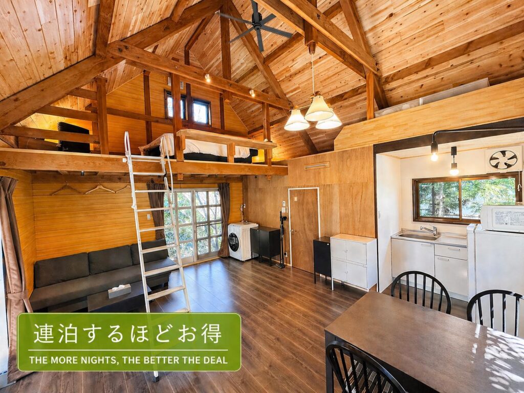 | Amenity goods | IH stove, various IH compatible frying pans, microwave, electric kettle, refrigerator, kitchen knives, cutting board, water purifier pot, various dishes & cutlery, washing machine, vacuum cleaner, Echo Dot (smart speaker), air conditioner, ceiling fan, hair dryer, bath towels, face towels, shampoo, conditioner, body soap, hand washing foam, coffee, black tea, Japanese tea, free WIFI, first aid kit, 2-burner BBQ stove (for outdoor use only), grill plate (for outdoor use only) |